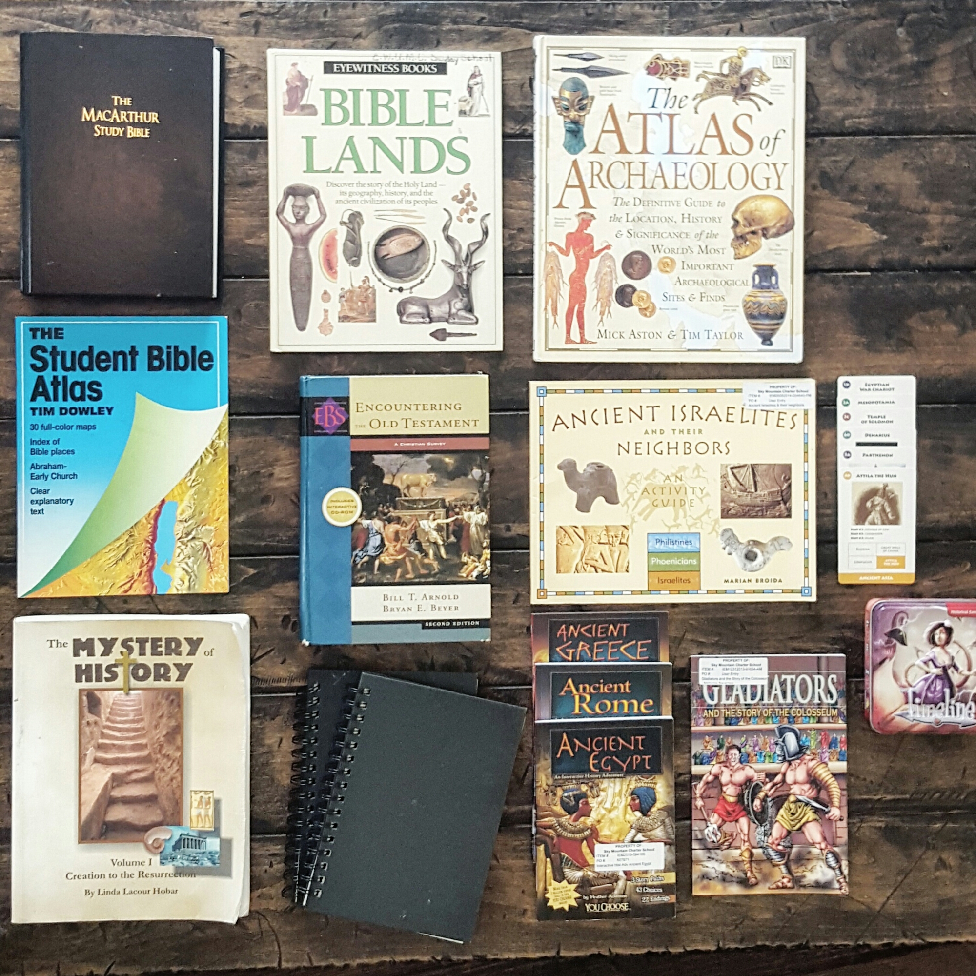 To provide a good background and knowledge of ancient biblical history, I read aloud from my old college textbook, Encountering The Old Testament. Chapters are broken up by OT sections and then books, so that each section and each book of the Old Testament has its overarching themes, location, main characters, issues, theorized dates, archeological evidences, and issues laid out. The material is intellectually weighty, but I’ve found that if I read with enthusiasm, engage my children, ask questions and reward correct or thoughtful answers, they grasp SO much! I highly recommend this book, or a similar one!